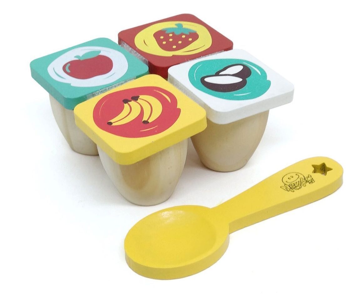 O kit iogurte vem com 4 potinhos de diferentes sabores e com uma colher. Os potinhos são grudados um ao outro com velcro, o que torna o brinquedo mais idêntico com a realidade!